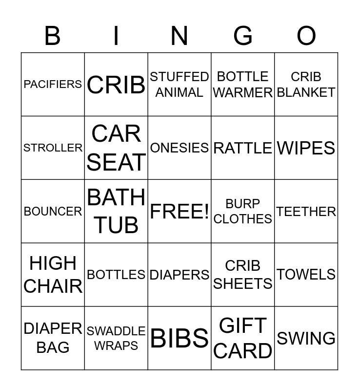 This bingo card has a free space and 24 words: BOTTLES, SWADDLE WRAPS, ONESIES, DIAPER BAG, CRIB BLANKET, PACIFIERS, STROLLER, CRIB, BURP CLOTHES, DIAPERS, RATTLE, BOUNCER, CRIB SHEETS, TOWELS, CAR SEAT, GIFT CARD, TEETHER, STUFFED ANIMAL, WIPES, BATH TUB, SWING, HIGH CHAIR, BOTTLE WARMER and BIBS.