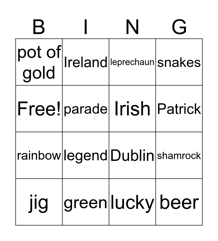 This bingo card has 16 words: green, shamrock, leprechaun, pot of gold, rainbow, Ireland, Dublin, lucky, Free!, parade, jig, snakes, legend, Patrick, Irish and beer.