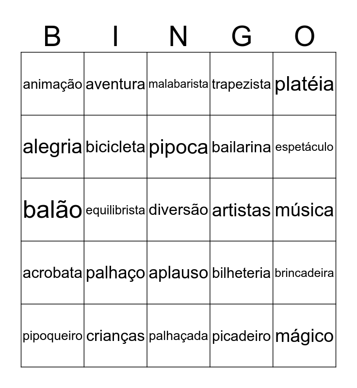 This bingo card has 25 words: palhaço, palhaçada, pipoca, pipoqueiro, platéia, animação, alegria, aventura, artistas, aplauso, bailarina, balão, bilheteria, brincadeira, bicicleta, mágico, música, malabarista, espetáculo, equilibrista, diversão, crianças, acrobata, trapezista and picadeiro.