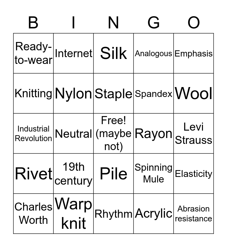This bingo card has a free space and 24 words: 19th century, Warp knit, Staple, Charles Worth, Emphasis, Ready-to-wear, Knitting, Internet, Rayon, Pile, Spandex, Industrial Revolution, Spinning Mule, Elasticity, Nylon, Acrylic, Levi Strauss, Silk, Wool, Neutral, Abrasion resistance, Rivet, Analogous and Rhythm.