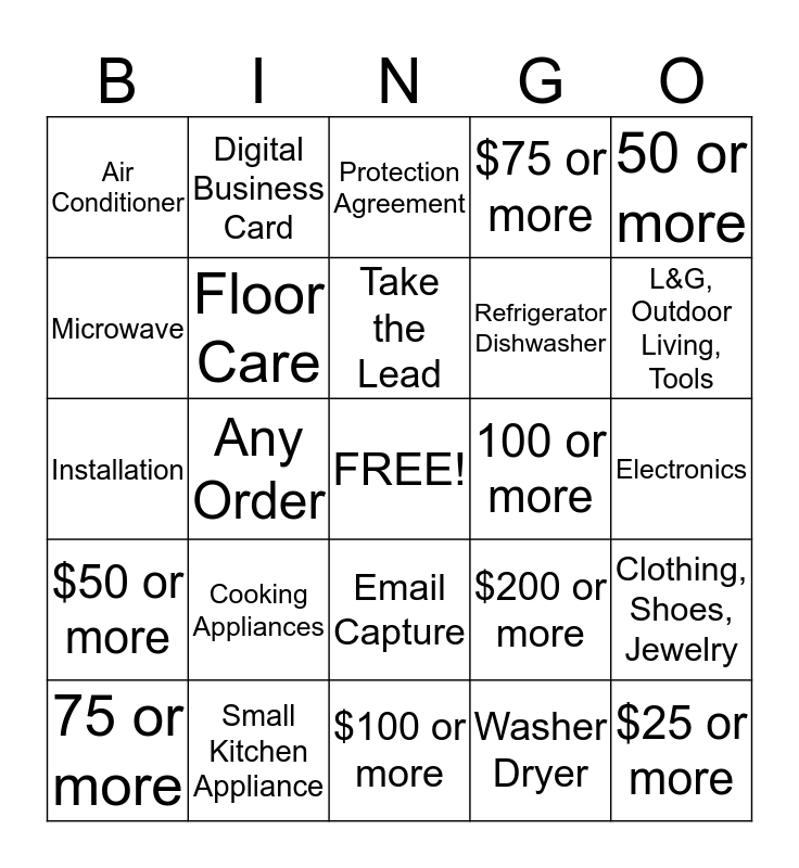 This bingo card has a free space and 24 words: Cooking Appliances, Small Kitchen Appliance, Take the Lead, 75 or more, 50 or more, Air Conditioner, Microwave, Digital Business Card, 100 or more, Email Capture, Refrigerator Dishwasher, Installation, $200 or more, Clothing, Shoes, Jewelry, Floor Care, Washer Dryer, Electronics, Protection Agreement, L&G, Outdoor Living, Tools, Any Order, $25 or more, $50 or more, $75 or more and $100 or more.