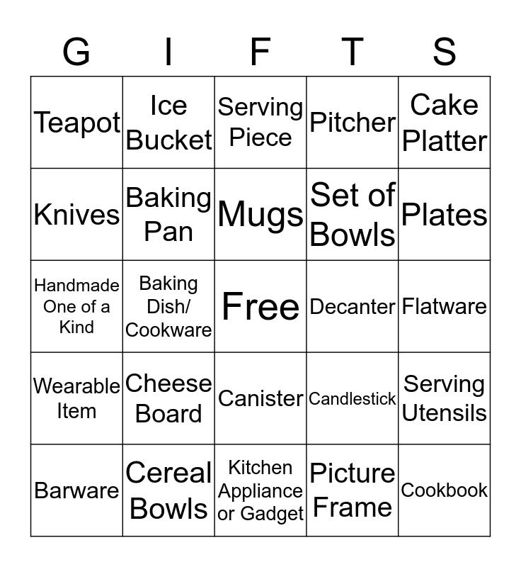 This bingo card has a free space and 24 words: Cheese Board, Cereal Bowls, Mugs, Barware, Cake Platter, Teapot, Knives, Ice Bucket, Decanter, Canister, Set of Bowls, Handmade One of a Kind, Candlestick, Serving Utensils, Baking Pan, Picture Frame, Flatware, Serving Piece, Plates, Baking Dish/ Cookware, Cookbook, Wearable Item, Pitcher and Kitchen Appliance or Gadget.