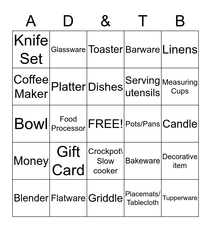 This bingo card has a free space and 24 words: Gift Card, Flatware, Dishes, Blender, Linens, Knife Set, Coffee Maker, Glassware, Pots/Pans, Crockpot\ Slow cooker, Serving utensils, Bowl, Bakeware, Decorative item, Platter, Placemats/ Tablecloth, Candle, Toaster, Measuring Cups, Food Processor, Tupperware, Money, Barware and Griddle.