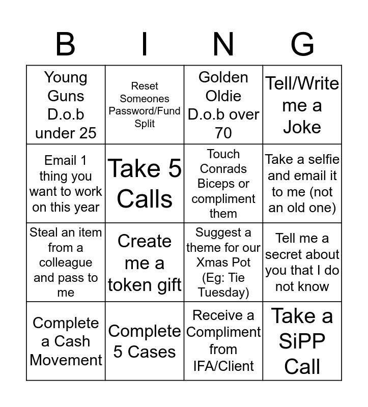 This bingo card has 16 words: Complete 5 Cases, Tell me a secret about you that I do not know, Golden Oldie D.o.b over 70, Young Guns D.o.b under 25, Steal an item from a colleague and pass to me, Reset Someones Password/Fund Split, Suggest a theme for our Xmas Pot (Eg: Tie Tuesday), Receive a Compliment from IFA/Client, Email 1 thing you want to work on this year, Take 5 Calls, Complete a Cash Movement, Tell/Write me a Joke, Create me a token gift, Take a selfie and email it to me (not an old one), Touch Conrads Biceps or compliment them and Take a SiPP Call.