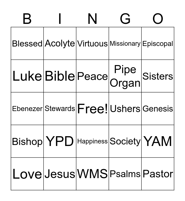 This bingo card has a free space and 24 words: YPD, Jesus, Peace, Love, Episcopal, Blessed, Luke, Acolyte, Ushers, Happiness, Pipe Organ, Ebenezer, Society, YAM, Bible, Psalms, Genesis, Virtuous, Sisters, Stewards, Pastor, Bishop, Missionary and WMS.