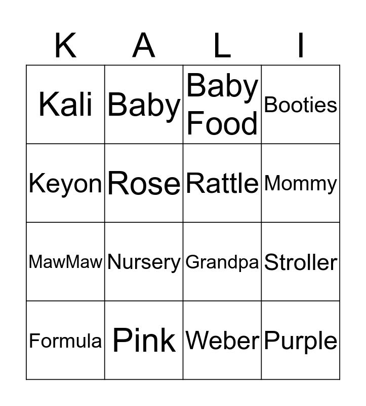 This bingo card has 16 words: Pink, Stroller, Baby Food, Kali, MawMaw, Baby, Grandpa, Weber, Keyon, Rose, Formula, Booties, Nursery, Mommy, Rattle and Purple.