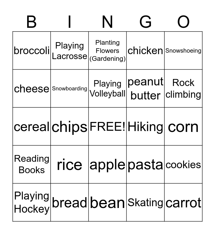 This bingo card has a free space and 34 words: Swimming, Skating, Skiing, Playing Football, Reading Books, Snowboarding, Snowshoeing, Playing Hockey, Playing Lacrosse, Playing Baseball, Playing Volleyball, Planting Flowers (Gardening), Sunbathing (Tanning), Skipping Rocks, Hiking, Rock climbing, bread, cereal, rice, pasta, apple, strawberries, broccoli, corn, bean, carrot, chicken, fish, peanut butter, cheese, ice cream, chips, cookies and lollypop.