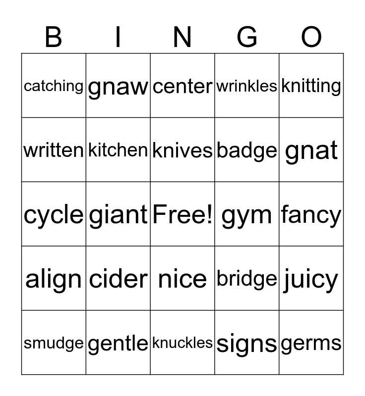 This bingo card has a free space and 24 words: cider, gentle, knives, smudge, knitting, catching, written, gnaw, gym, nice, badge, cycle, bridge, juicy, kitchen, signs, fancy, center, gnat, giant, germs, align, wrinkles and knuckles.