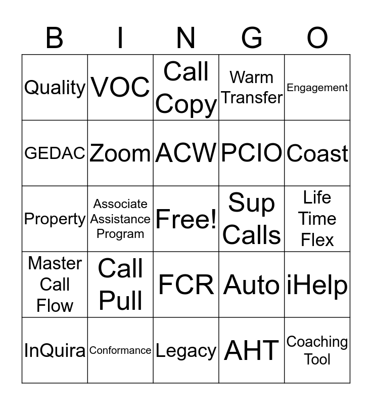 This bingo card has a free space and 26 words: FCR, AHT, ACW, Conformance, Engagement, Quality, GEDAC, VOC, Life Time Flex, Auto, PCIO, Property, iHelp, InQuira, Associate Assistance Program, Yammer, Warm Transfer, Master Call Flow, Call Copy, Coaching Tool, Coast, Legacy, Sup Calls, Call Pull, Zoom and Bam.