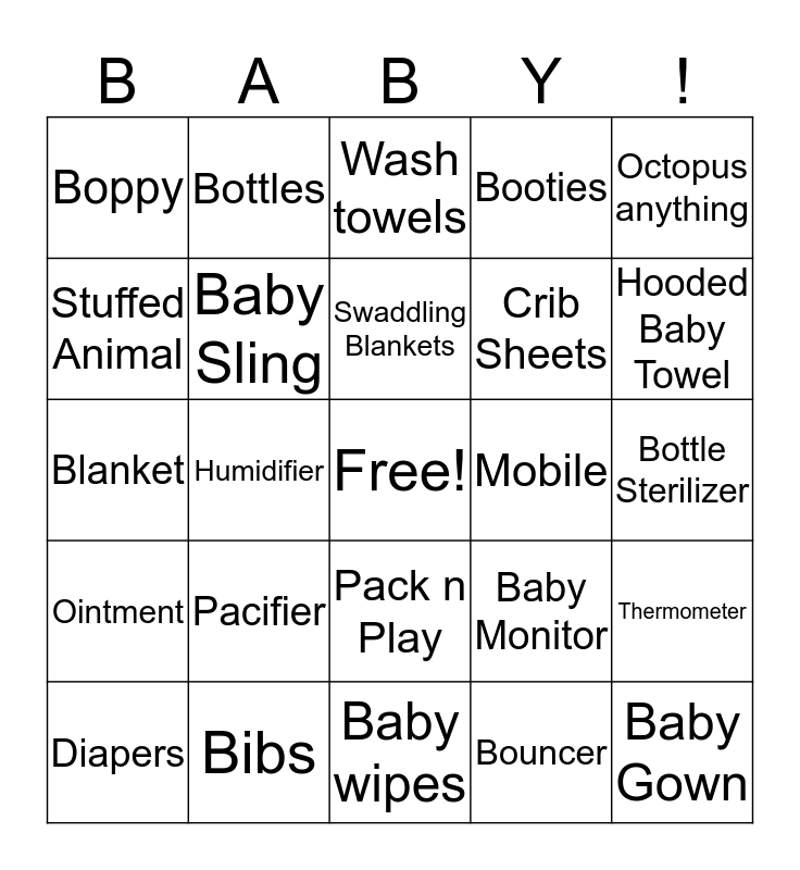 This bingo card has a free space and 24 words: Pacifier, Bibs, Swaddling Blankets, Diapers, Octopus anything, Boppy, Stuffed Animal, Bottles, Mobile, Pack n Play, Crib Sheets, Blanket, Baby Monitor, Thermometer, Baby Sling, Bouncer, Bottle Sterilizer, Wash towels, Hooded Baby Towel, Humidifier, Baby Gown, Ointment, Booties and Baby wipes.