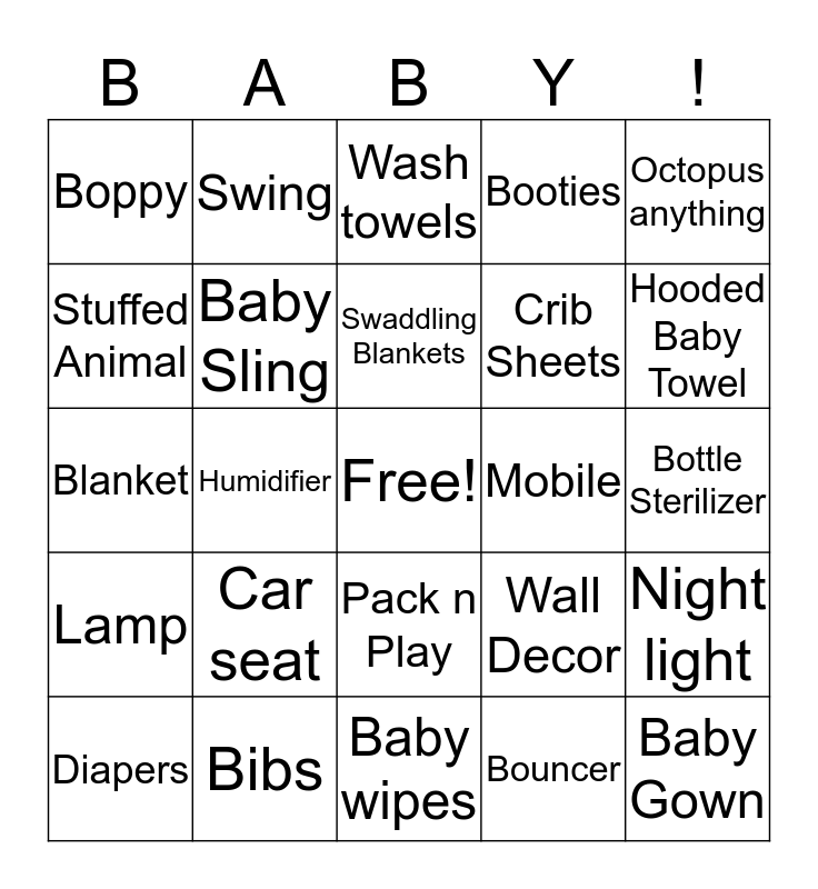 This bingo card has a free space and 24 words: Car seat, Bibs, Swaddling Blankets, Diapers, Octopus anything, Boppy, Stuffed Animal, Swing, Mobile, Pack n Play, Crib Sheets, Blanket, Wall Decor, Night light, Baby Sling, Bouncer, Bottle Sterilizer, Wash towels, Hooded Baby Towel, Humidifier, Baby Gown, Lamp, Booties and Baby wipes.