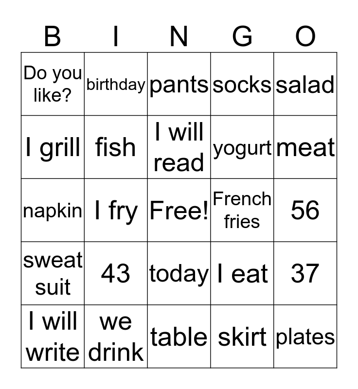 This bingo card has a free space and 24 words: 43, we drink, I will read, I will write, salad, Do you like?, I grill, birthday, French fries, today, yogurt, napkin, I eat, 37, fish, skirt, 56, pants, meat, I fry, plates, sweat suit, socks and table.