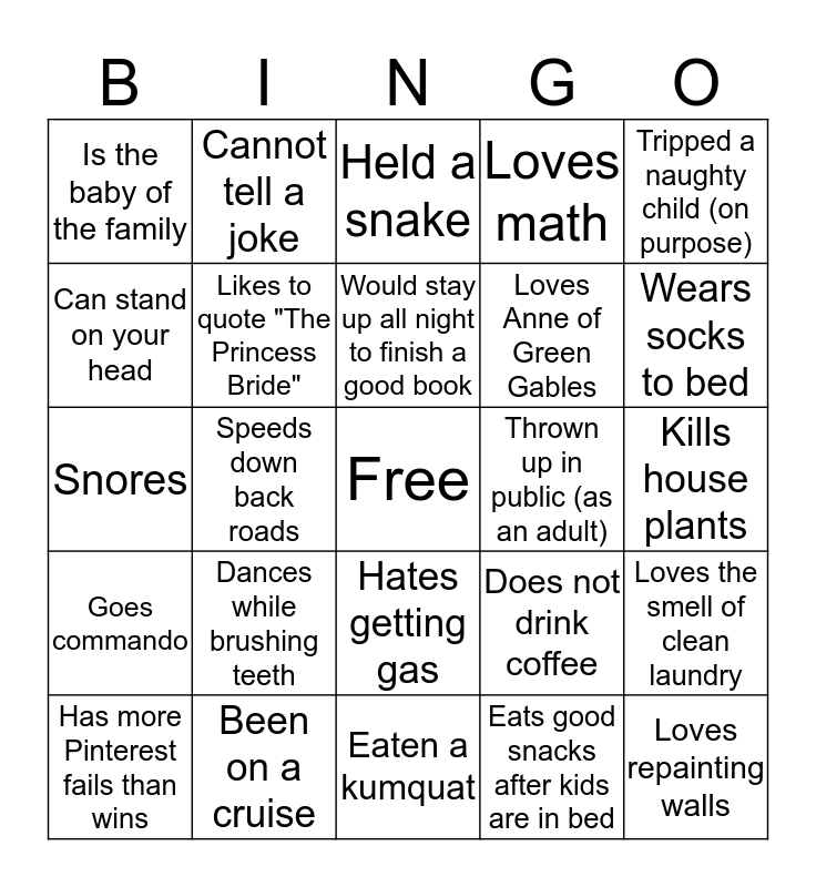 This bingo card has a free space and 24 words: Dances while brushing teeth, Been on a cruise, Would stay up all night to finish a good book, Has more Pinterest fails than wins, Tripped a naughty child (on purpose), Is the baby of the family, Can stand on your head, Cannot tell a joke, Thrown up in public (as an adult), Hates getting gas, Loves Anne of Green Gables, Snores, Does not drink coffee, Loves the smell of clean laundry, Likes to quote "The Princess Bride", Eats good snacks after kids are in bed, Kills house plants, Held a snake, Wears socks to bed, Speeds down back roads, Loves repainting walls, Goes commando, Loves math and Eaten a kumquat.