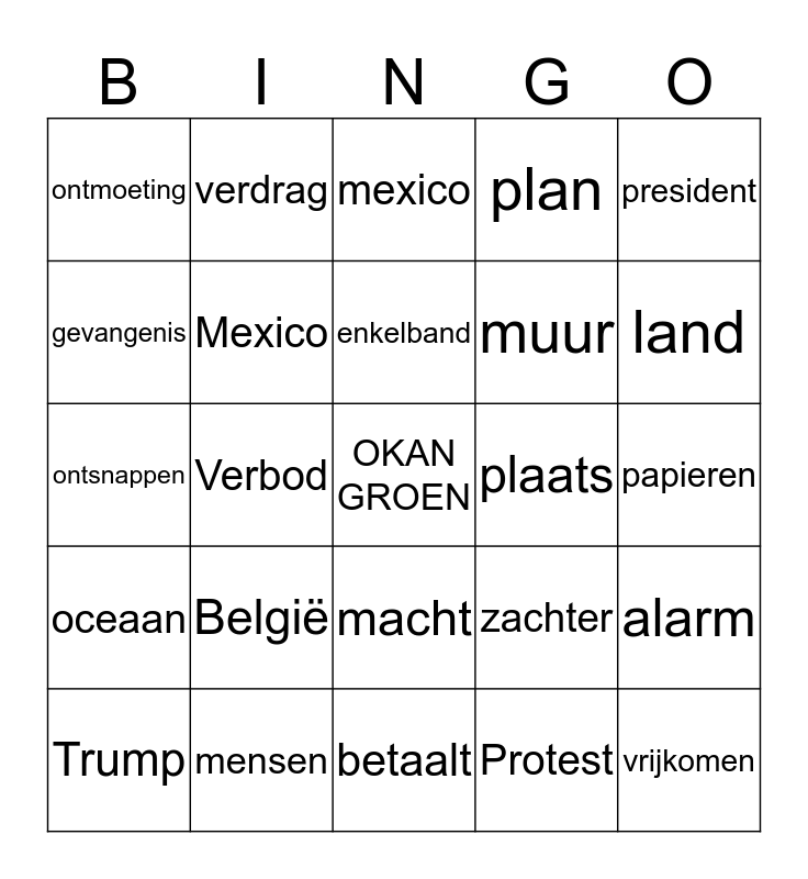 This bingo card has a free space and 24 words: België, mensen, enkelband, Trump, president, ontmoeting, gevangenis, verdrag, plaats, macht, muur, ontsnappen, zachter, alarm, Mexico, Protest, papieren, mexico, land, Verbod, vrijkomen, oceaan, plan and betaalt.