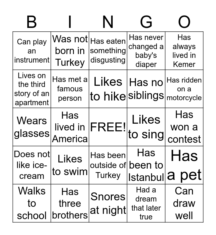 This bingo card has a free space and 24 words: Likes to swim, Has three brothers, Likes to hike, Walks to school, Has always lived in Kemer, Can play an instrument, Lives on the third story of an apartment, Was not born in Turkey, Likes to sing, Has been outside of Turkey, Has no siblings, Wears glasses, Has been to Istanbul, Has a pet, Has met a famous person, Had a dream that later true, Has won a contest, Has eaten something disgusting, Has ridden on a motorcycle, Has lived in America, Can draw well, Does not like ice-cream, Has never changed a baby's diaper and Snores at night.