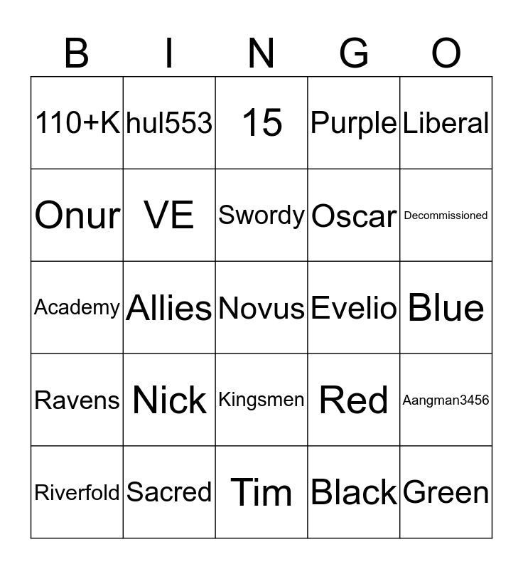 This bingo card has 25 words: Nick, Tim, Swordy, Riverfold, Liberal, 110+K, Onur, hul553, Evelio, Kingsmen, Oscar, Academy, Red, Aangman3456, VE, Green, Blue, 15, Decommissioned, Allies, Novus, Sacred, Ravens, Purple and Black.