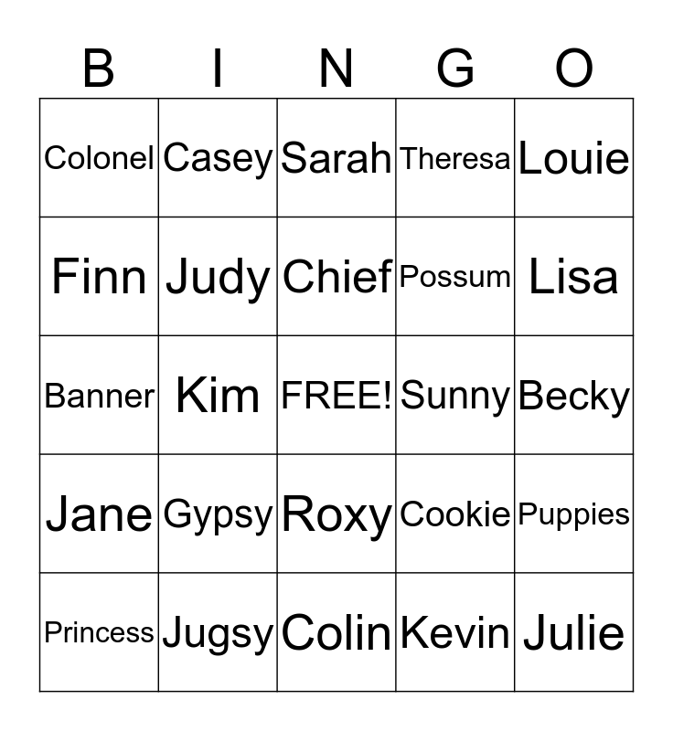 This bingo card has a free space and 24 words: Gypsy, Jugsy, Chief, Princess, Louie, Colonel, Finn, Casey, Sunny, Roxy, Possum, Banner, Cookie, Puppies, Judy, Kevin, Becky, Sarah, Lisa, Kim, Julie, Jane, Theresa and Colin.