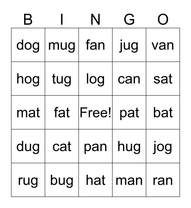This bingo card has a free space and 24 words: cat, bug, log, rug, van, dog, hog, mug, pat, pan, can, mat, hug, jog, tug, man, bat, fan, sat, fat, ran, dug, jug and hat.