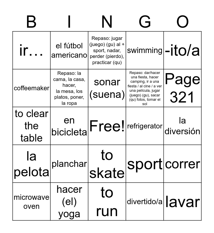This bingo card has a free space and 166 words: Vocabulario, Los verbos, pelear, to fight, sonar (suena), to ring; to sound, tocarle (qu) a uno (like gustar), to be someone's turn, Repaso: deber, necesitar, tener que, Los pasatiempos, diversiones y aficiones, la afición, hobby, la diversión, fun activity, el pasatiempo, pastime, los ratos libres, spare (free) time, el tiempo libre, free time, aburrirse, to get bored, caminar, to walk, dar una caminata, to hike; to go for a hike, dar un paseo, to take a walk, hacer un picnic, to have a picnic, hacer planes (m.) para + inf., to make plans to (do something), hacer (el) yoga, to do yoga, ir…, to go . . ., a un bar / a una discoteca, to a bar / to a disco, a un museo, to a museum, al teatro / a un concierto, to the theater / to a concert, jugar (juego) (gu) al ajedrez / a las cartas / a los videojuegos, to play chess/cards/videogames, ser…, to be …, aburrido/a, boring, divertido/a, fun, Repaso: dar/hacer una fiesta, hacer camping, ir a una fiesta / al cine / a ver una película, jugar (juego) (gu), sacar (qu) fotos, tomar el sol, Los deportes, correr, to run, entrenar, to practice; to train, esquiar (esquío), to ski, ganar, to win, hacer surfing, to surf, montar a caballo, to ride a horse, montar/pasear, to ride, en bicicleta, a bicycle, patinar, to skate, ser aficionado/a (a), to be a fan (of ), Repaso: jugar (juego) (gu) al + sport, nadar, perder (pierdo), practicar (qu), el ciclismo, bicycling, el deporte, sport, el equipo, team, el fútbol, soccer, el fútbol americano, football, el/la jugador(a), player, la natación, swimming, el partido, game, match, el patinaje, skating, la pelota, ball, Cognados: el basquetbol, el béisbol, el esquí, el golf, el hockey, el tenis, el voleibol, Page 321, Algunos aparatos domésticos, el aparato doméstico, home appliance, la aspiradora, vacuum cleaner, la cafetera, coffeemaker, el congelador, freezer, el horno de microondas, microwave oven, la lavadora, washing machine, el lavaplatos, dishwasher, el refrigerador, refrigerator, la secadora, clothes dryer, la tostadora, toaster, Repaso: la estufa, Los quehaceres domésticos, el quehacer doméstico, household chore, barrer el piso, to sweep the floor, hacer la cama, to make the bed, lavar, to wash, limpiar (la casa), to clean (house), pasar la aspiradora, to vacuum, planchar, to iron, poner la mesa, to set the table, quitar la mesa, to clear the table, sacar (qu) la basura, to take out the trash, Repaso: la cama, la casa, hacer, la mesa, los platos, poner, la ropa, Otros sustantivos, la escuela, school, el/la niñero/a, baby-sitter, Los adjetivos, deportivo/a, sporting, sports (adj.); sports-loving, doméstico/a, domestic, related to the home, libre, free, unoccupied, pesado/a, boring; difficult, -ito/a, small, little, Palabras adicionales, al aire libre, outdoors, de adolescente, as an adolescent, de niño/a, as a child, en la actualidad, currently, right now, mientras and while.