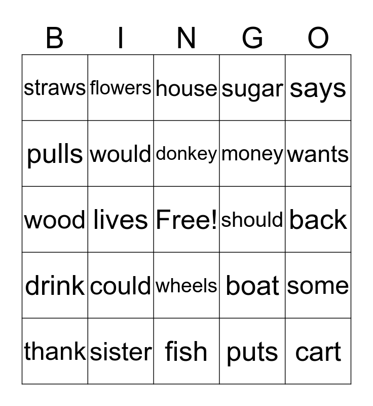 This bingo card has a free space and 24 words: could, sister, donkey, thank, says, straws, pulls, flowers, should, wheels, money, wood, boat, some, would, puts, back, house, wants, lives, cart, drink, sugar and fish.