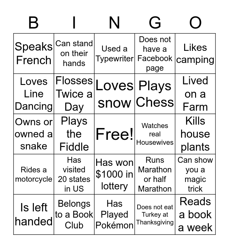 This bingo card has a free space and 24 words: Has visited 20 states in US, Belongs to a Book Club, Loves snow, Is left handed, Likes camping, Speaks French, Loves Line Dancing, Can stand on their hands, Watches real Housewives, Has won $1000 in lottery, Plays Chess, Owns or owned a snake, Runs Marathon or half Marathon, Can show you a magic trick, Flosses Twice a Day, Does not eat Turkey at Thanksgiving, Kills house plants, Used a Typewriter, Lived on a Farm, Plays the Fiddle, Reads a book a week, Rides a motorcycle, Does not have a Facebook page and Has Played Pokémon.
