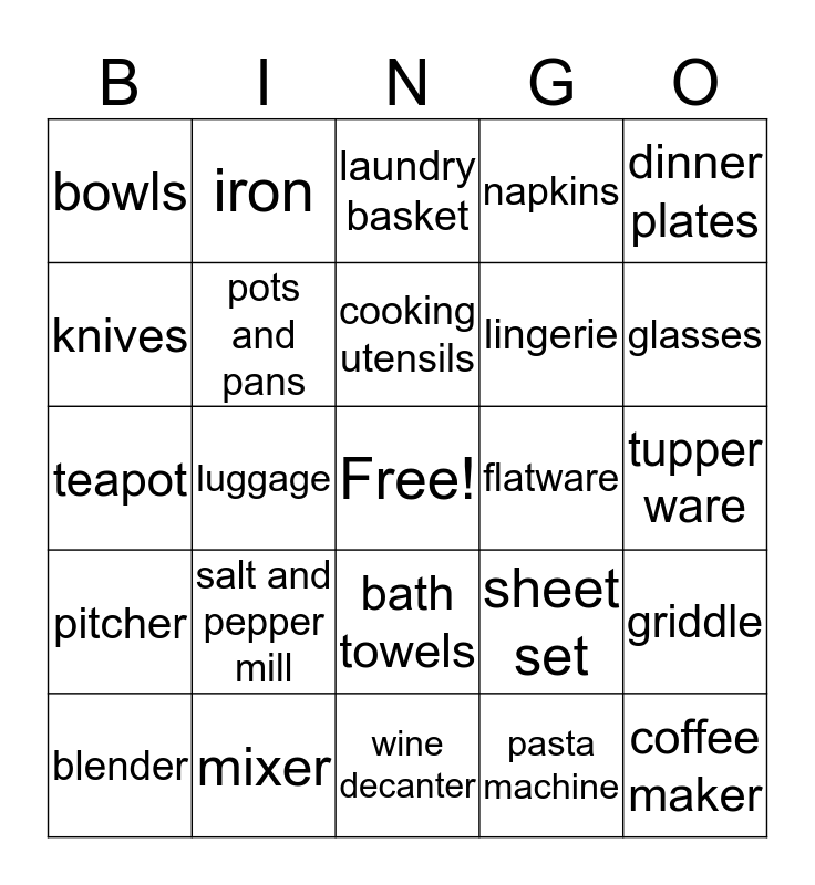 This bingo card has a free space and 24 words: salt and pepper mill, mixer, cooking utensils, blender, dinner plates, bowls, knives, iron, flatware, bath towels, lingerie, teapot, sheet set, griddle, pots and pans, pasta machine, tupper ware, laundry basket, glasses, luggage, coffee maker, pitcher, napkins and wine decanter.