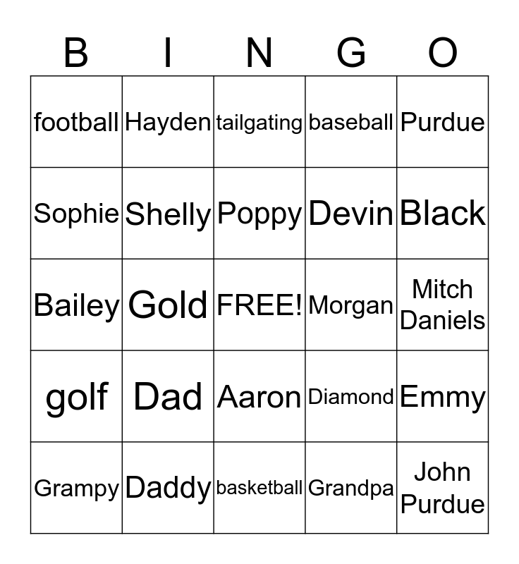 This bingo card has a free space and 24 words: Dad, Daddy, Poppy, Grampy, Purdue, football, Sophie, Hayden, Morgan, Aaron, Devin, Bailey, Diamond, Emmy, Shelly, Grandpa, Mitch Daniels, tailgating, Black, Gold, John Purdue, golf, baseball and basketball.