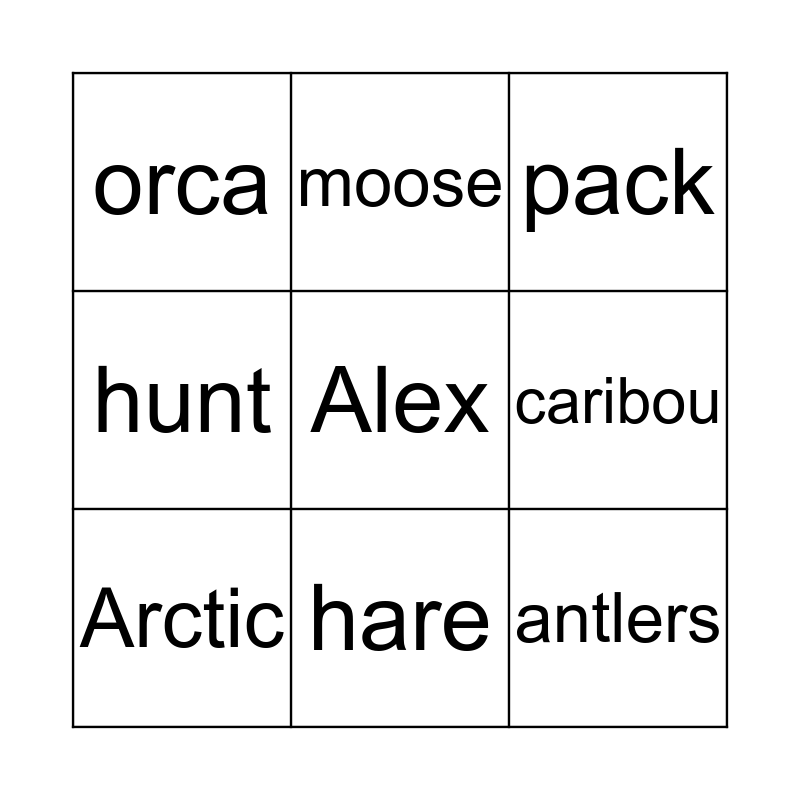 This bingo card has a free space and 8 words: caribou, pack, moose, Arctic, orca, antlers, hunt and hare.