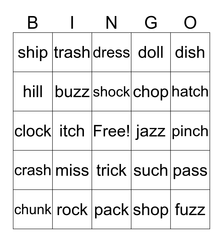 This bingo card has a free space and 24 words: miss, rock, shock, chunk, dish, ship, hill, trash, jazz, trick, chop, clock, such, pass, buzz, shop, pinch, dress, hatch, itch, fuzz, crash, doll and pack.