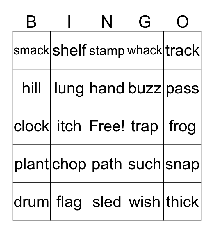 This bingo card has a free space and 24 words: chop, flag, hand, drum, track, smack, hill, shelf, trap, path, buzz, clock, such, snap, lung, wish, frog, stamp, pass, itch, thick, plant, whack and sled.