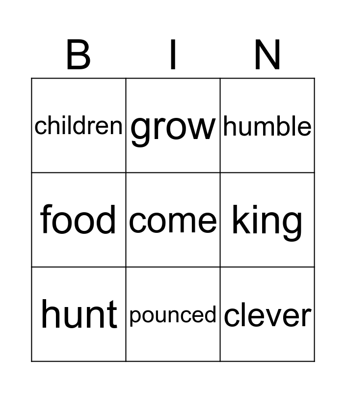 This bingo card has a free space and 8 words: king, humble, grow, hunt, children, clever, food and pounced.