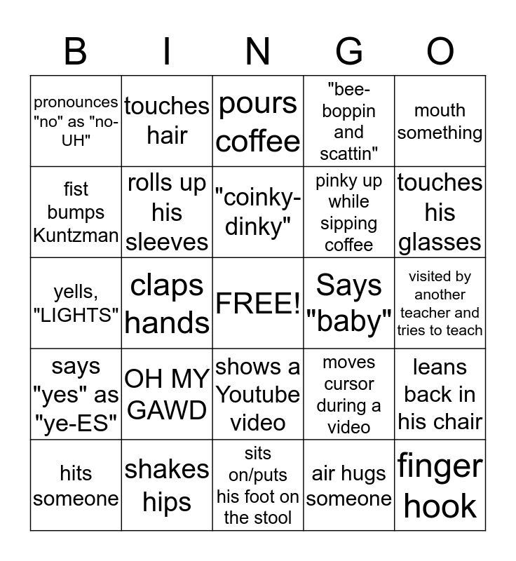 This bingo card has a free space and 24 words: OH MY GAWD, shakes hips, "coinky-dinky", hits someone, mouth something, pronounces "no" as "no-UH", fist bumps Kuntzman, touches hair, Says "baby", shows a Youtube video, pinky up while sipping coffee, yells, "LIGHTS", moves cursor during a video, leans back in his chair, rolls up his sleeves, air hugs someone, visited by another teacher and tries to teach, pours coffee, touches his glasses, claps hands, finger hook, says "yes" as "ye-ES", "bee-boppin and scattin" and sits on/puts his foot on the stool.