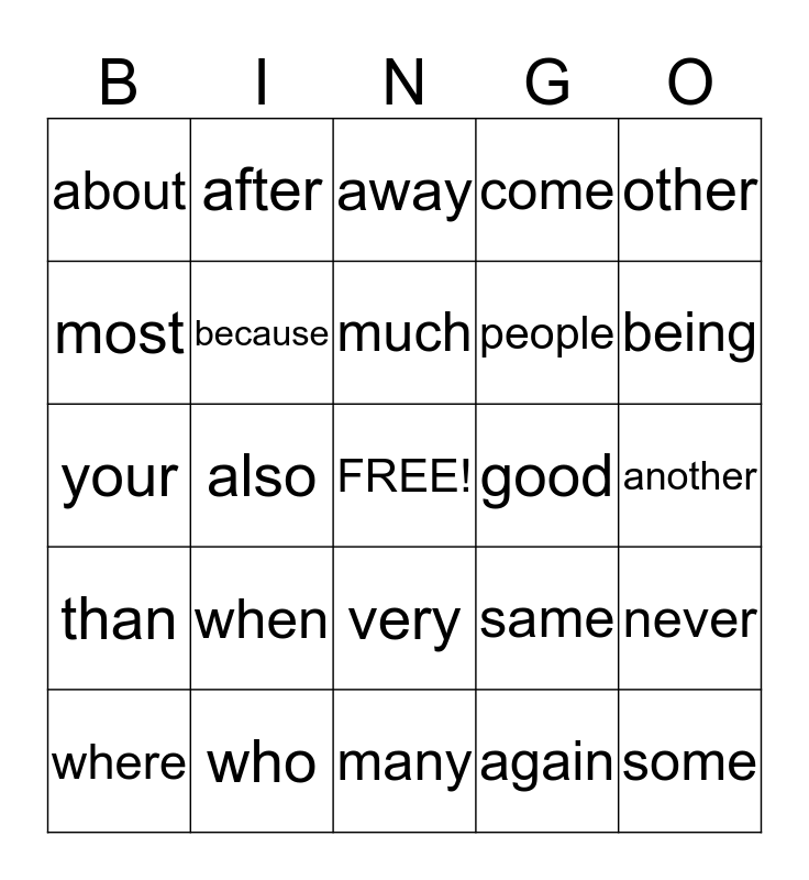 This bingo card has a free space and 24 words: when, who, much, where, other, about, most, after, good, very, people, your, same, never, because, again, another, away, being, also, some, than, come and many.