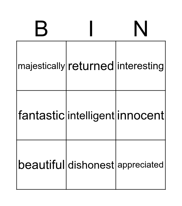 This bingo card has 9 words: beautiful, interesting, returned, fantastic, majestically, innocent, intelligent, appreciated and dishonest.