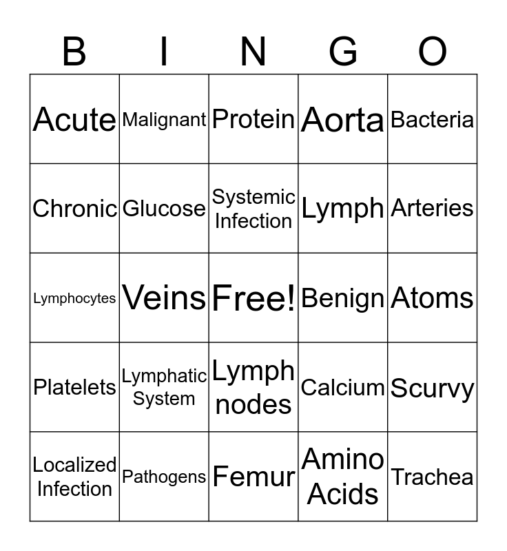 This bingo card has a free space and 24 words: Lymphatic System, Pathogens, Systemic Infection, Localized Infection, Bacteria, Acute, Chronic, Malignant, Benign, Lymph nodes, Lymph, Lymphocytes, Calcium, Scurvy, Glucose, Amino Acids, Atoms, Protein, Arteries, Veins, Trachea, Platelets, Aorta and Femur.
