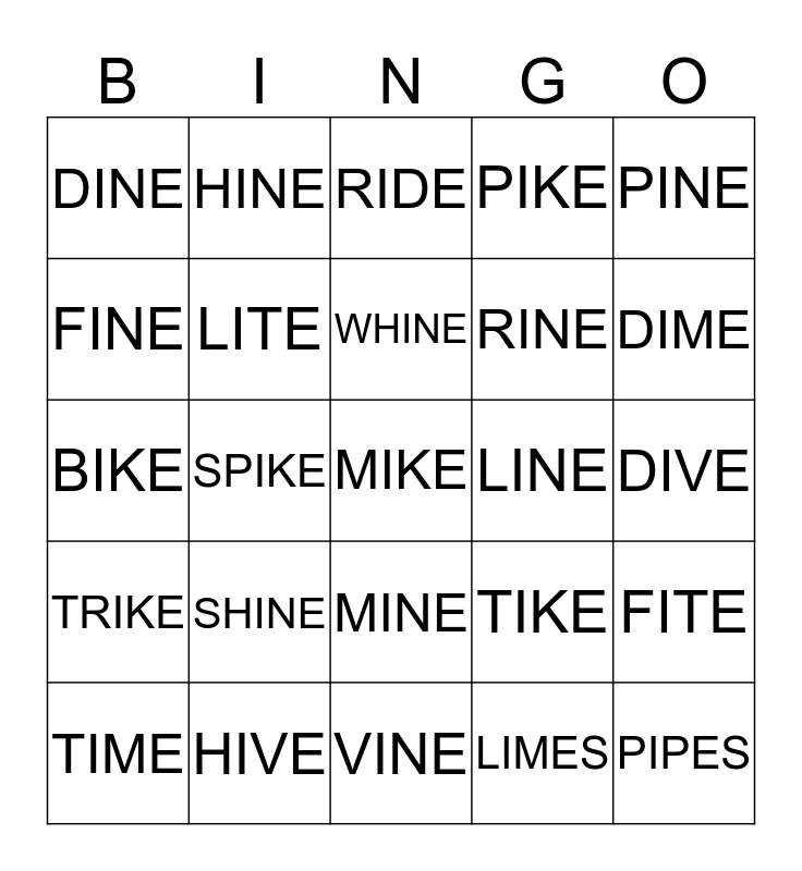 This bingo card has 25 words: SHINE, VINE, WHINE, TIME, PINE, DINE, FINE, HINE, LINE, MINE, RINE, BIKE, TIKE, FITE, LITE, PIPES, DIVE, RIDE, DIME, SPIKE, MIKE, HIVE, TRIKE, PIKE and LIMES.
