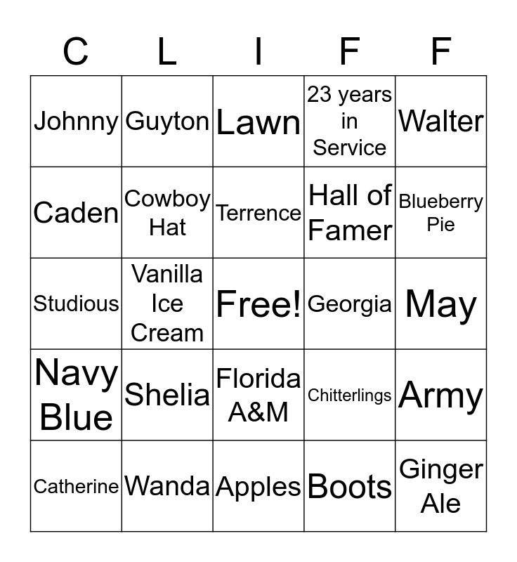 This bingo card has a free space and 24 words: Shelia, Wanda, Terrence, Catherine, Walter, Johnny, Caden, Guyton, Georgia, Florida A&M, Hall of Famer, Studious, Chitterlings, Army, Cowboy Hat, Boots, May, Lawn, Blueberry Pie, Vanilla Ice Cream, Ginger Ale, Navy Blue, 23 years in Service and Apples.
