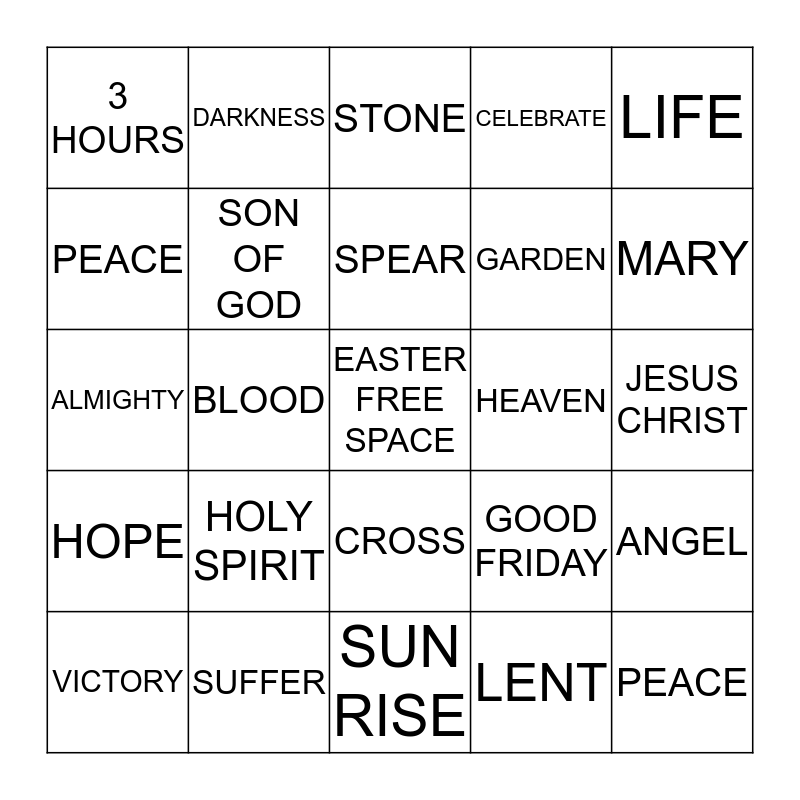 This bingo card has a free space and 24 words: HOLY SPIRIT, SUFFER, SPEAR, VICTORY, LIFE, 3 HOURS, PEACE, DARKNESS, HEAVEN, CROSS, GARDEN, ALMIGHTY, GOOD FRIDAY, ANGEL, SON OF GOD, LENT, JESUS CHRIST, STONE, MARY, BLOOD, PEACE, HOPE, CELEBRATE and SUN RISE.