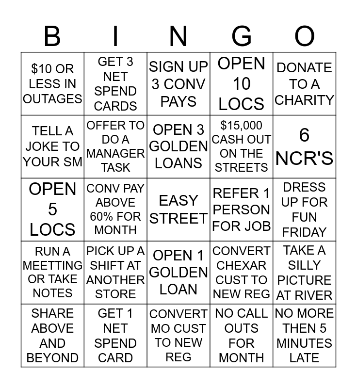 This bingo card has a free space and 24 words: PICK UP A SHIFT AT ANOTHER STORE, GET 1 NET SPEND CARD, OPEN 3 GOLDEN LOANS, SHARE ABOVE AND BEYOND, DONATE TO A CHARITY, $10 OR LESS IN OUTAGES, TELL A JOKE TO YOUR SM, GET 3 NET SPEND CARDS, REFER 1 PERSON FOR JOB, OPEN 1 GOLDEN LOAN, $15,000 CASH OUT ON THE STREETS, OPEN 5 LOCS, CONVERT CHEXAR CUST TO NEW REG, TAKE A SILLY PICTURE AT RIVER, OFFER TO DO A MANAGER TASK, NO CALL OUTS FOR MONTH, DRESS UP FOR FUN FRIDAY, SIGN UP 3 CONV PAYS, 6 NCR'S, CONV PAY ABOVE 60% FOR MONTH, NO MORE THEN 5 MINUTES LATE, RUN A MEETTING OR TAKE NOTES, OPEN 10 LOCS and CONVERT MO CUST TO NEW REG.
