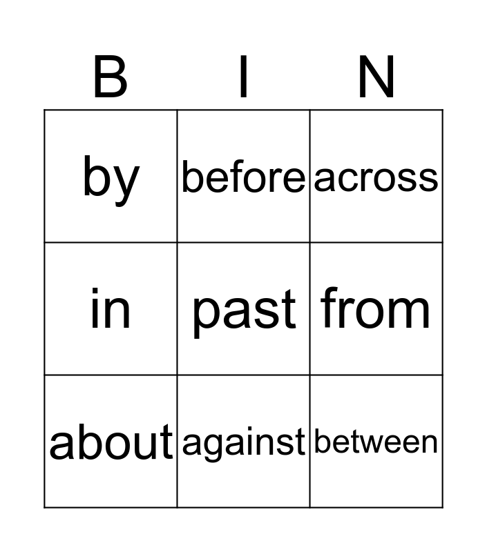 This bingo card has 9 words: about, across, before, in, by, from, past, between and against.