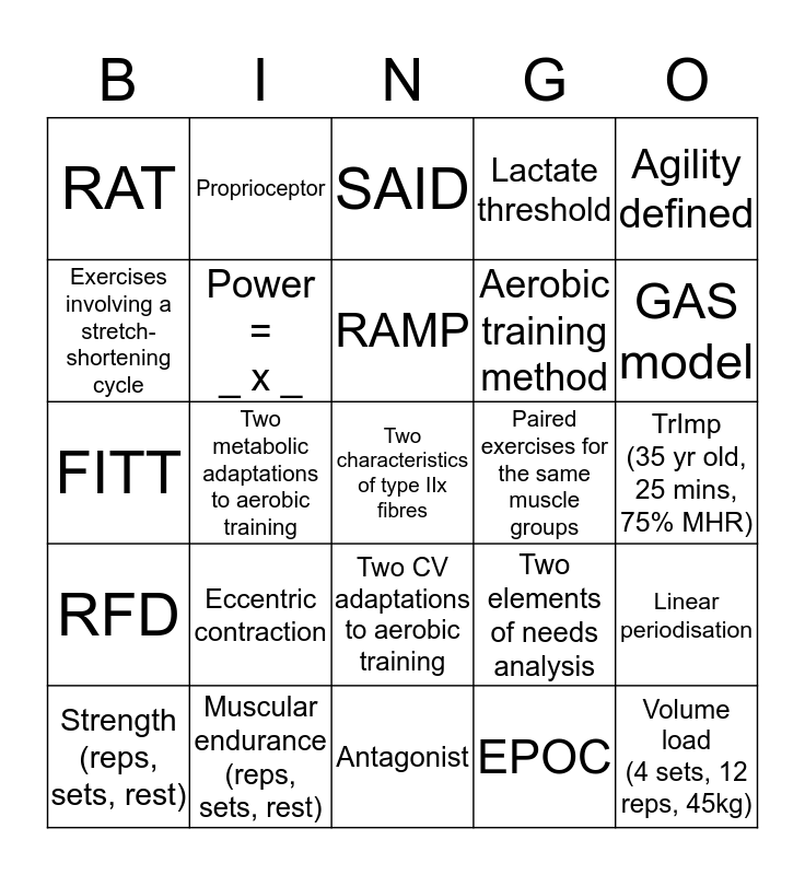 This bingo card has 25 words: Eccentric contraction, Antagonist, RAMP, Strength (reps, sets, rest), Agility defined, RAT, Exercises involving a stretch-shortening cycle, Proprioceptor, Paired exercises for the same muscle groups, Two CV adaptations to aerobic training, Aerobic training method, FITT, Two elements of needs analysis, Linear periodisation, Power = _ x _, Volume load (4 sets, 12 reps, 45kg), TrImp (35 yr old, 25 mins, 75% MHR), SAID, GAS model, Two metabolic adaptations to aerobic training, Two characteristics of type IIx fibres, Muscular endurance (reps, sets, rest), RFD, Lactate threshold and EPOC.