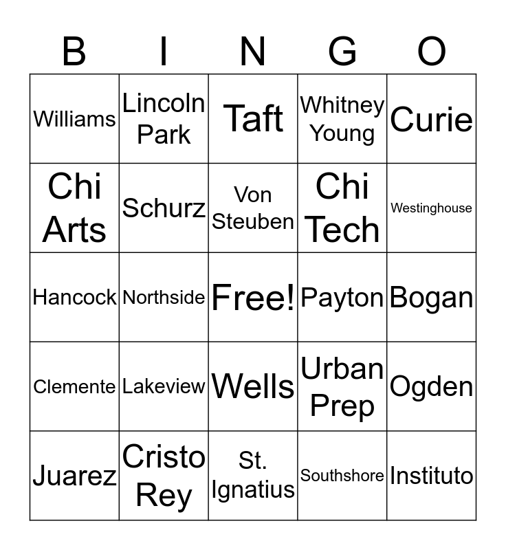 This bingo card has a free space and 29 words: Juarez, Jones, Northside, Lane Tech, Williams, Taft, Schurz, Lakeview, Payton, Cristo Rey, Bogan, Instituto, St. Ignatius, Southshore, Westinghouse, Farragut, Wells, Clemente, Curie, Hancock, Urban Prep, Uplift, Chi Tech, Chi Arts, Whitney Young, Lincoln Park, Ogden, Von Steuben and Roosevelt.