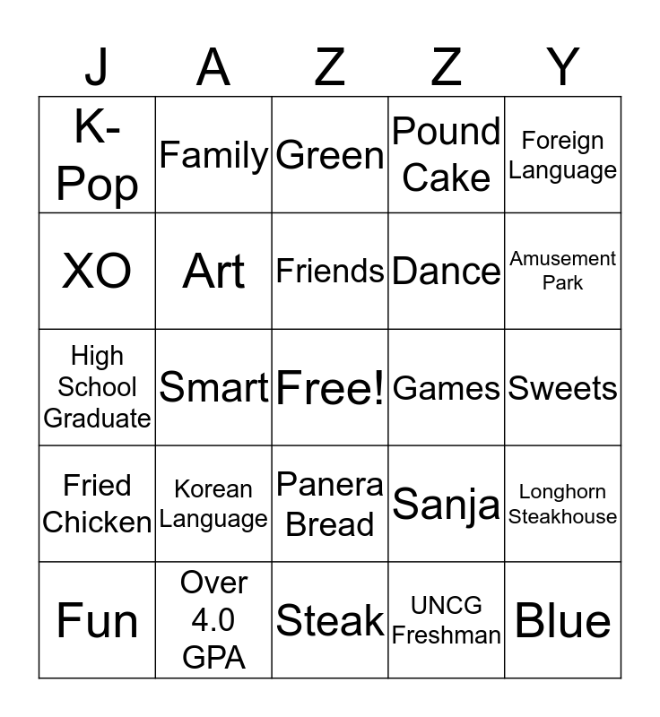This bingo card has a free space and 24 words: Korean Language, Over 4.0 GPA, Friends, Fun, Foreign Language, K-Pop, XO, Family, Games, Panera Bread, Dance, High School Graduate, Sanja, Longhorn Steakhouse, Art, UNCG Freshman, Sweets, Green, Amusement Park, Smart, Blue, Fried Chicken, Pound Cake and Steak.