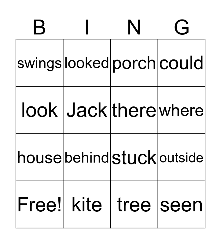 This bingo card has 16 words: kite, outside, porch, swings, house, looked, stuck, tree, look, Jack, Free!, could, behind, where, there and seen.