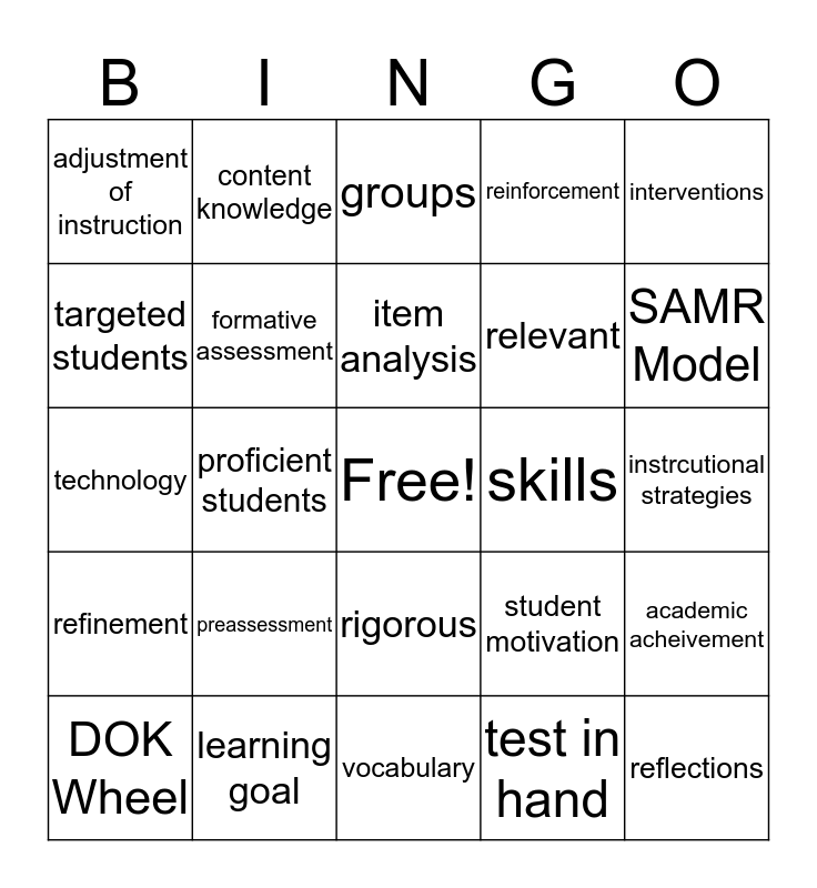 This bingo card has a free space and 24 words: preassessment, learning goal, item analysis, DOK Wheel, interventions, adjustment of instruction, targeted students, content knowledge, skills, rigorous, relevant, technology, student motivation, academic acheivement, formative assessment, test in hand, instrcutional strategies, groups, SAMR Model, proficient students, reflections, refinement, reinforcement and vocabulary.