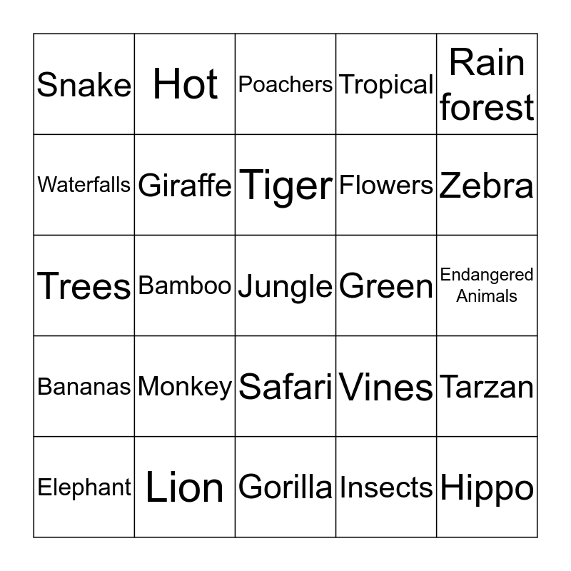 This bingo card has a free space and 24 words: Monkey, Lion, Tiger, Elephant, Rain forest, Snake, Waterfalls, Hot, Green, Safari, Flowers, Trees, Vines, Tarzan, Giraffe, Insects, Endangered Animals, Poachers, Zebra, Bamboo, Hippo, Bananas, Tropical and Gorilla.