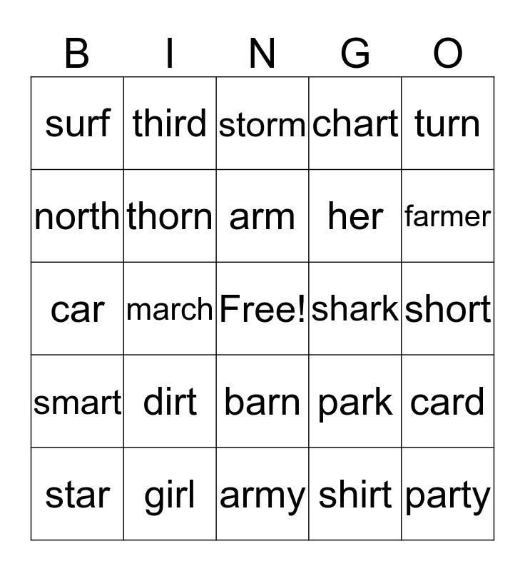 This bingo card has a free space and 24 words: dirt, girl, arm, star, turn, surf, north, third, shark, barn, her, car, park, card, thorn, shirt, short, storm, farmer, march, party, smart, chart and army.