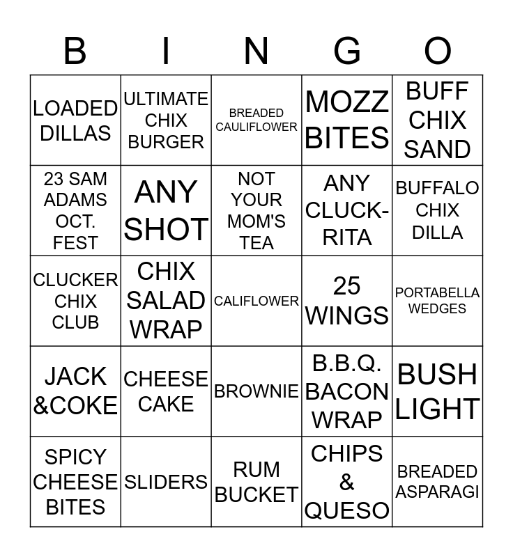 This bingo card has a free space and 24 words: CHEESE CAKE, SLIDERS, NOT YOUR MOM'S TEA, SPICY CHEESE BITES, BUFF CHIX SAND, LOADED DILLAS, 23 SAM ADAMS OCT. FEST, ULTIMATE CHIX BURGER, 25 WINGS, BROWNIE, ANY CLUCK-RITA, CLUCKER CHIX CLUB, B.B.Q. BACON WRAP, BUSH LIGHT, ANY SHOT, CHIPS & QUESO, PORTABELLA WEDGES, BREADED CAULIFLOWER, BUFFALO CHIX DILLA, CHIX SALAD WRAP, BREADED ASPARAGI, JACK &COKE, MOZZ BITES and RUM BUCKET.