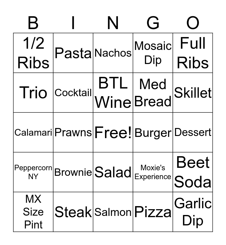 This bingo card has a free space and 24 words: Brownie, Steak, BTL Wine, MX Size Pint, Full Ribs, 1/2 Ribs, Trio, Pasta, Burger, Salad, Med Bread, Calamari, Moxie's Experience, Beet Soda, Cocktail, Pizza, Dessert, Nachos, Skillet, Prawns, Garlic Dip, Peppercorn NY, Mosaic Dip and Salmon.