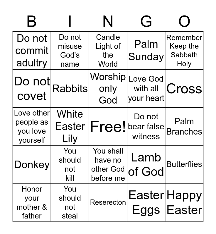 This bingo card has a free space and 24 words: You should not kill, You should not steal, Worship only God, Honor your mother & father, Remember Keep the Sabbath Holy, Do not commit adultry, Do not covet, Do not misuse God's name, Do not bear false witness, You shall have no other God before me, Love God with all your heart, Love other people as you love yourself, Lamb of God, Butterflies, Rabbits, Easter Eggs, Palm Branches, Candle Light of the World, Cross, White Easter Lily, Happy Easter, Donkey, Palm Sunday and Reserecton.